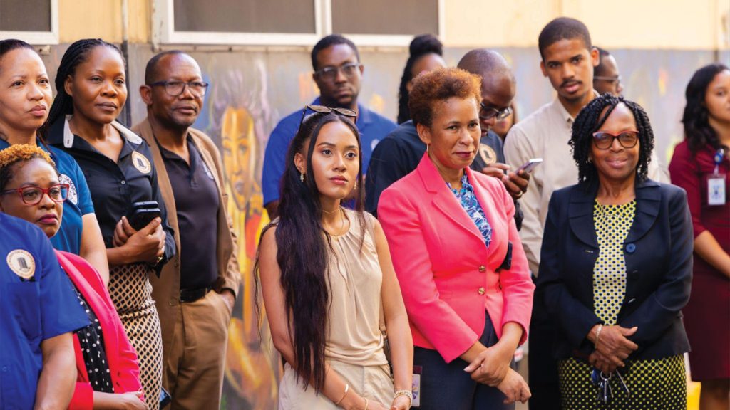 Members of the Bank of Jamaica team together with mural artist